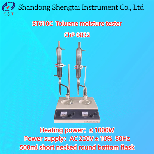 Il tester di umidità per il metodo del toluene ST610C è progettato e fabbricato secondo i requisiti tecnici e le normative pertinenti del quarto metodo del metodo del toluene nella Farmacopea 2025 0832 per la determinazione dell'umidità. È principalmente adatto per la determinazione dell'umidità di materiali medicinali cinesi, preparati e altri materiali.