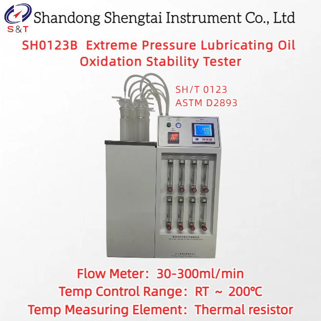 SH0123B Extreme Pressure Lubricating Oil Oxidation Stability Tester is designed and manufactured in accordance with the requirements specified in the industry standard of the People's Republic of China, SH/T 0123 "Metodo di prova per la stabilità di ossidazione degli oli lubrificanti ad estrema pressione", adatto per la determinazione di oli lubrificanti ad estrema pressione (come gli oli per ingranaggi).Il metodo di funzionamento è il seguente:: il campione è esposto ad aria secca a pressione costante a una certa temperatura per 312 ore.La stabilità di ossidazione dell'olio è indicata misurando l'aumento della viscosità cinematica a 100°C e la variazione del valore del sedimento del campione.