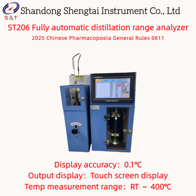L'analizzatore automatico completo del range di distillazione ST206 è dotato di uno schermo LCD a colori, dialogo uomo-macchina con menu in cinese, funzionamento guidato e processo di misurazione completamente automatizzato. Progettato in conformità con i requisiti del metodo di determinazione del range di distillazione della Farmacopea Cinese 2025, Regola Generale 0611, il range di distillazione si riferisce all'intervallo di temperatura di un liquido distillato secondo il metodo seguente, calibrato alla pressione atmosferica standard [101,3 kPa (760 mmHg)], dall'inizio della distillazione della quinta goccia fino a quando vengono distillati solo 3-4 ml o una certa proporzione del volume del campione di prova.